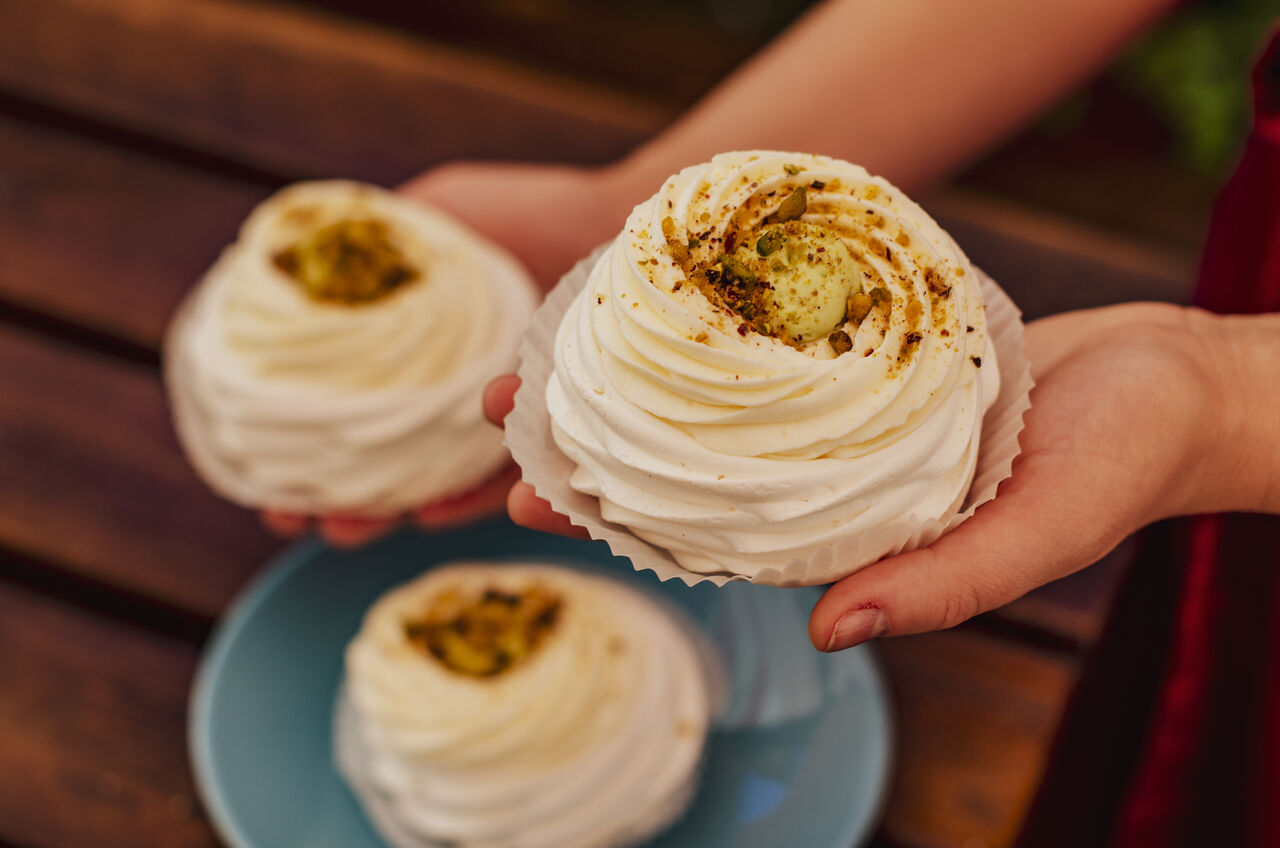 "Фісташкова Павлова" - фісташкова паста, подрібнена фісташка, чіз крем з додаванням вершків, меренговий кошик.